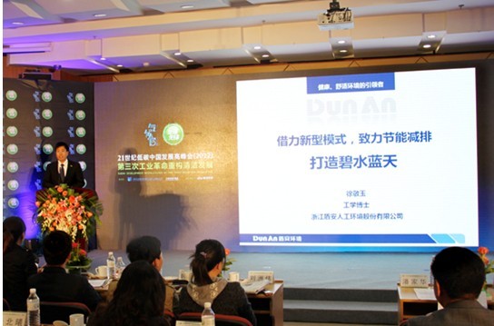 本屆峰會(huì)的主題為“第三次工業(yè)革命重構(gòu)清潔發(fā)展”,從“第三次工業(yè)革命”的背景出發(fā),前瞻國家政策,分析清潔發(fā)展圖景,交流企業(yè)應(yīng)對戰(zhàn)略。盾安環(huán)境“環(huán)境優(yōu)化與系統(tǒng)集成”事業(yè)部總經(jīng)理助理徐敬玉在會(huì)上做了《借力新型模式,致力節(jié)能減排,打造碧水藍(lán)天》的主題演講。盾安環(huán)境始終堅(jiān)持“低碳節(jié)能、綠色發(fā)展”的理念,全面實(shí)施產(chǎn)業(yè)轉(zhuǎn)型升級,實(shí)現(xiàn)由傳統(tǒng)產(chǎn)品制造商向系統(tǒng)集成服務(wù)商的華麗轉(zhuǎn)身。2011年在天津設(shè)立盾安節(jié)能產(chǎn)業(yè)總部后,瞄準(zhǔn)工業(yè)余熱、城市污水及可再生能源銳意開拓,通過創(chuàng)新的商業(yè)模式、專業(yè)化的節(jié)能技術(shù)助力城市節(jié)能減排,不僅獲得各地政府與能耗企業(yè)的歡迎與好評,屢獲大單,確立了盾安節(jié)能在節(jié)能服務(wù)行業(yè)的領(lǐng)軍地位,還實(shí)現(xiàn)了工業(yè)企業(yè)、地方政府、社會(huì)大眾與盾安的多方共贏局面。