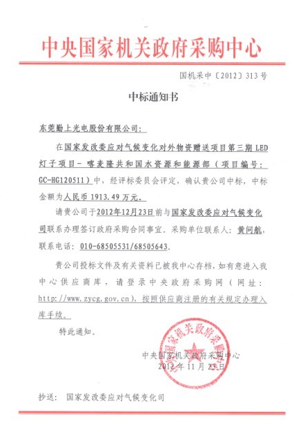 近日,勤上光電收到了由中央國(guó)家機(jī)關(guān)政府采購(gòu)中心發(fā)出的《中標(biāo)通知書》(國(guó)機(jī)采中[2012]313號(hào)),確定為國(guó)家發(fā)改委應(yīng)對(duì)氣候變化對(duì)外物資贈(zèng)送項(xiàng)目第三期LED燈子項(xiàng)目喀麥隆共和國(guó)水資源和能源部的中標(biāo)人,中標(biāo)金額為1913.49萬(wàn)元。