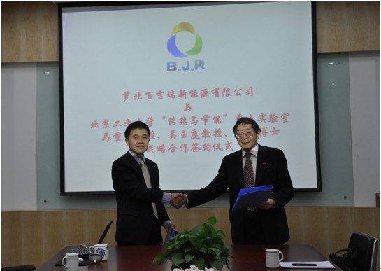 2014年4月11日,蘿北百吉瑞新能源有限公司與北京工業(yè)大學(xué)“傳熱與節(jié)能”重點(diǎn)實(shí)驗(yàn)室主任馬重芳教授團(tuán)隊(duì)關(guān)于共同開發(fā)太陽(yáng)能熱電站中熔融鹽的全套蓄熱(儲(chǔ)能)系統(tǒng)產(chǎn)學(xué)研一體化深度戰(zhàn)略合作簽約儀式在北京舉行。 百吉瑞新能源將憑借北工大馬重芳教授研發(fā)團(tuán)隊(duì)的技術(shù)優(yōu)勢(shì),采用馬重芳教授團(tuán)隊(duì)在中高溫熔融鹽傳熱、蓄熱(儲(chǔ)能)領(lǐng)域十多年的研究成果,推出擁有全部國(guó)內(nèi)獨(dú)家自主知識(shí)產(chǎn)權(quán)的熔融鹽配制、融化和蓄熱等系統(tǒng)、設(shè)備及服務(wù),進(jìn)軍國(guó)內(nèi)外巨大的太陽(yáng)能熱發(fā)電市場(chǎng)領(lǐng)域,并以此為契機(jī)加快推動(dòng)中國(guó)熔融鹽蓄熱(儲(chǔ)能)產(chǎn)業(yè)化進(jìn)程。合作雙方百吉瑞董事長(zhǎng)薛凌云、北京工業(yè)大學(xué)馬重芳教授均對(duì)未來(lái)前景充滿信心。業(yè)內(nèi)權(quán)威代表及相關(guān)專家對(duì)雙方合作后的技術(shù)優(yōu)勢(shì)和市場(chǎng)理念給予了高度評(píng)價(jià),并對(duì)其可能對(duì)國(guó)內(nèi)太陽(yáng)能光熱發(fā)電熔鹽蓄熱產(chǎn)業(yè)化進(jìn)程帶來(lái)的推動(dòng)作用寄予厚望。