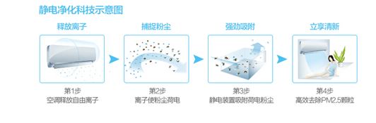 靜電除塵科技 超強(qiáng)污染吸附 美的空調(diào)通過(guò)不斷的技術(shù)研究開(kāi)發(fā),率先打造靜電除塵工藝,實(shí)現(xiàn)污染物的有效吸附?照{(diào)本體通過(guò)自由離子的釋放,使得空氣中的粉塵荷電,最終通過(guò)空調(diào)體內(nèi)的靜電裝置吸附荷電粉塵,最終去除PM2.5顆粒,實(shí)現(xiàn)空氣凈化。