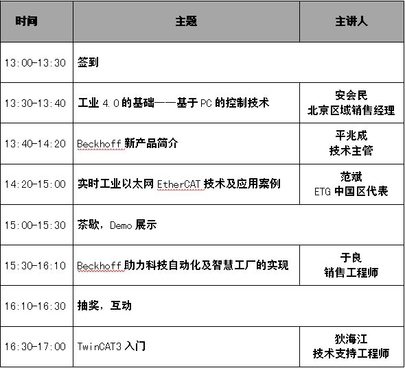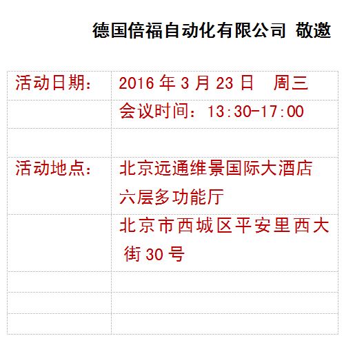 尊敬的 女士/先生: 信息技術(shù)和自動化技術(shù)的融合是工業(yè)4.0的核心理論。Beckhoff基于PC的自動化解決方案為用戶實現(xiàn)工業(yè)4.0提供了理想的控制架構(gòu)。為使北京地區(qū)用戶能夠更加深入了解到Beckhoff支持工業(yè)4.0的先進技術(shù)和典型應(yīng)用,我們將于3月23日在北京遠通維景大酒店舉行“基于PC的控制技術(shù)助力工業(yè)4.0——2016德國倍福北京技術(shù)交流會”。會上將分享Beckhoff的最新產(chǎn)品、實時工業(yè)以太網(wǎng)EtherCAT、科技自動化與智慧工廠的實現(xiàn)、TwinCAT入門等內(nèi)容。歡迎廣大用戶報名參加。 我們誠摯邀請您參加本次技術(shù)交流會。與您共同探討和分享基于工業(yè)4.0的Beckhoff自動化解決方案。 請攜帶閣下名片參加,期待您的光臨!