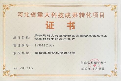 目前,工程技術(shù)研究中心承擔(dān)了六項重點研究項目,河北省科技廳和廊坊市科技局將共同為項目研究提供110萬元的專項建設(shè)資金。項目的主要研究領(lǐng)域涉及水性涂料與汽車涂料,重點研究方向則聚焦于高性能、環(huán)保性和便捷的應(yīng)用性板塊。項目完成后,預(yù)計銷售額可以新增3800萬元。此外,車用高固體份罩光清漆是該工程技術(shù)研究中心正在研發(fā)的產(chǎn)品。對此,河北省科技廳也為之提供了150萬元的重大科技成果專項資金支持。這不僅是對立邦技術(shù)研發(fā)的肯定,更為立邦與產(chǎn)業(yè)鏈伙伴的合作奠定了基礎(chǔ)。值得一提的是,立邦后續(xù)依次還申報了四項河北省節(jié)能環(huán)保技術(shù)成果和河北省工信廳A級研發(fā)平臺項目。6月,廊坊立邦涂料有限公司申報的“多功能超支化聚合物在高固含高性能汽車涂膜材料中的應(yīng)用推廣”項目,開發(fā)出了施工VOC含量低于420g/L的高固含高性能汽車清漆涂料,成功申報為河北省重大科技成果轉(zhuǎn)化項目。工程技術(shù)研究中心的負責(zé)人表示:“隨著工程技術(shù)研究中心建設(shè)的不斷完善,技術(shù)人才的持續(xù)培養(yǎng)和引進,今后將會有更多優(yōu)秀的專項申報!