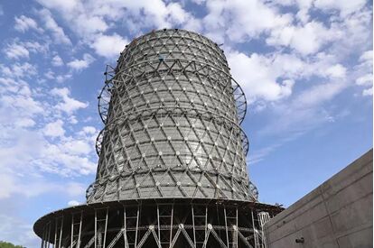 此塔采用蒙皮內(nèi)置結(jié)構形式,即鋼構件在外,蒙皮在內(nèi),此種形式在世界上也是首次應用。這種結(jié)構形式能把煙氣和鋼構件完全隔離開,杜絕了煙氣對鋼構件的腐蝕,保證了鋼塔在整個服役期間的安全性和穩(wěn)定性。 經(jīng)過大膽創(chuàng)新,精心設計,麟北發(fā)電廠建設的世界首例鋼結(jié)構煙塔合一間冷塔,將成為中國火電建設史上又一工程典范。