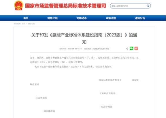 8月8日,國家標準化管理委員會、國家發(fā)展和改革委員會、工業(yè)和信息化部等六部門聯(lián)合印發(fā)《氫能產(chǎn)業(yè)標準體系建設(shè)指南(2023版)》,這是國家層面首個氫能全產(chǎn)業(yè)鏈標準體系建設(shè)指南。