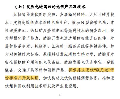 ▲2022年8月工信部公開發(fā)布《關(guān)于推動(dòng)能源電子產(chǎn)業(yè)發(fā)展的指導(dǎo)意見(征求意見稿)》提出:要發(fā)展先進(jìn)高效的光伏產(chǎn)品及技術(shù),探索建立光伏“碳足跡”評(píng)價(jià)標(biāo)準(zhǔn)并開展認(rèn)證