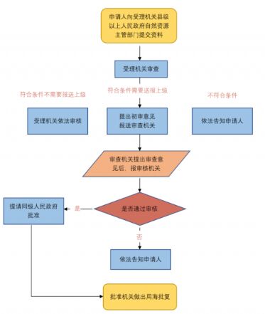 申請(qǐng)批復(fù)取得海域,海域使用申請(qǐng)實(shí)行“屬地受理,逐級(jí)上報(bào)”的原則,依據(jù)用海方式和用海面積確定審批權(quán)限?h級(jí)以上人民政府自然資源主管部門是海域使用申請(qǐng)的受理機(jī)關(guān),在受理后應(yīng)將海域使用申請(qǐng)逐級(jí)上報(bào)到有審批權(quán)的人民政府所屬的自然資源主管部門審核,并報(bào)有審批權(quán)的人民政府批準(zhǔn)。