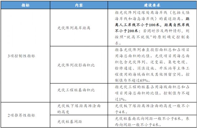 相關(guān)規(guī)范和標(biāo)準(zhǔn)規(guī)定,陸上光伏10MW光伏方陣用地指標(biāo)上限100公頃,海上風(fēng)電單個(gè)風(fēng)場(chǎng)外緣邊線包絡(luò)海域面積每10MW控制在16平方公里左右。為貫徹集約節(jié)約利用海域和海岸資源原則,有地方先于國(guó)家形成了海上光伏項(xiàng)目用?刂浦笜(biāo)。根據(jù)浙自然資規(guī)〔2022〕18號(hào)文件,針對(duì)開(kāi)放海域的樁基式光伏項(xiàng)目提出了3項(xiàng)控制性指標(biāo)(光伏陣列離岸距離、光伏陣列投影面積比、光伏工程樁基面積比)和2項(xiàng)推薦性指標(biāo)(光伏板下緣距離灘涂面的高度、光伏樁基間距)。