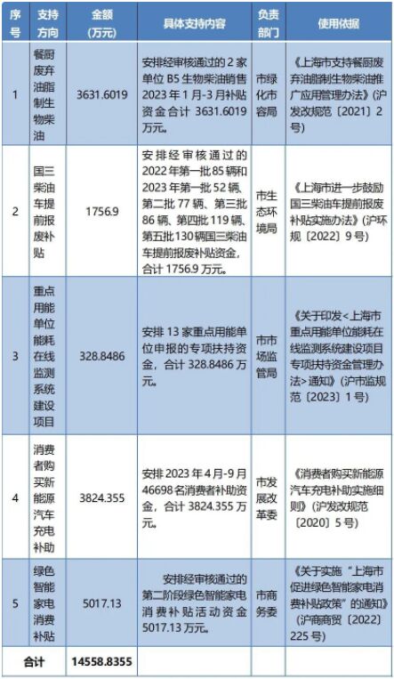 上海市2023年節(jié)能減排專項資金安排計劃(第二批)發(fā)布啦!支持方向為餐廚廢棄油脂制生物柴油、國三柴油車提前報廢補貼、重點用能單位能耗在線監(jiān)測系統(tǒng)建設(shè)項目、消費者購買新能源汽車充電補助、綠色智能家電消費補貼等5項工作,計劃下達節(jié)能減排專項資金14558.8355萬元,詳見↓