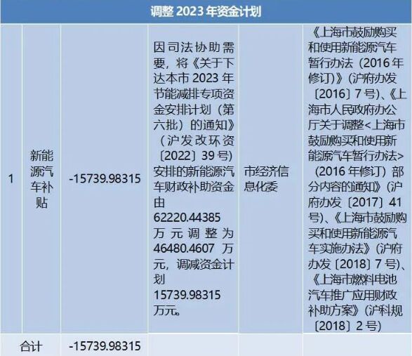 1、因司法協(xié)助需要,將《關(guān)于下達(dá)本市2023年節(jié)能減排專項(xiàng)資金安排計劃(第六批)的通知》(滬發(fā)改環(huán)資〔2022〕39號)安排的新能源汽車財政補(bǔ)助資金由62220.44385萬元調(diào)整為46480.4607萬元,調(diào)減資金計劃15739.98315萬元。