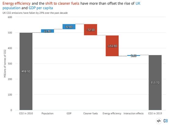 英國二氧化碳排放的下降主要靠能效的提高和低碳能源替代。與2010年(碳排放4.98億噸)相比,因為人口增加導致碳排放增加2240萬噸、經(jīng)濟增長導致碳排放3280萬噸,而低碳能源替代導致碳排放下降7250億噸,而能效的提高導致碳排放下降高達1.33億噸。
