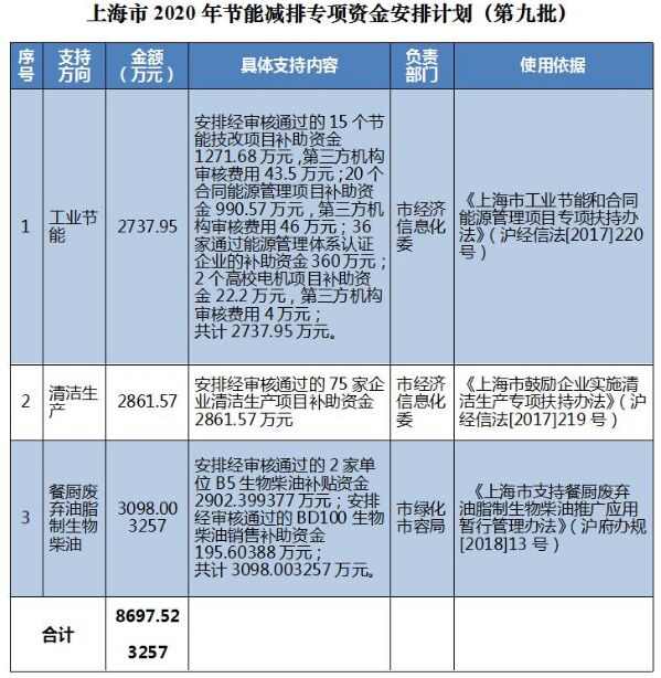 安排計(jì)劃 1、按照《上海市工業(yè)節(jié)能和合同能源管理項(xiàng)目專項(xiàng)扶持辦法》(滬經(jīng)信法[2017]220號(hào))等相關(guān)規(guī)定,安排經(jīng)審核通過的15個(gè)節(jié)能技改項(xiàng)目補(bǔ)助資金1271.68萬(wàn)元,第三方機(jī)構(gòu)審核費(fèi)用43.5萬(wàn)元;20個(gè)合同能源管理項(xiàng)目補(bǔ)助資金990.57萬(wàn)元,第三方機(jī)構(gòu)審核費(fèi)用46萬(wàn)元;36家通過能源管理體系認(rèn)證企業(yè)的補(bǔ)助資金360萬(wàn)元;2個(gè)高效電機(jī)項(xiàng)目補(bǔ)助資金22.2萬(wàn)元,第三方機(jī)構(gòu)審核費(fèi)用4萬(wàn)元;共計(jì)2737.95萬(wàn)元。 2、按照《上海市鼓勵(lì)企業(yè)實(shí)施清潔生產(chǎn)專項(xiàng)扶持辦法》(滬經(jīng)信法[2017]219號(hào))等相關(guān)規(guī)定,安排經(jīng)審核通過的75家企業(yè)清潔生產(chǎn)項(xiàng)目補(bǔ)助資金2861.57萬(wàn)元。 3、按照《上海市支持餐廚廢棄油脂制生物柴油推廣應(yīng)用暫行管理辦法》(滬府辦規(guī)[2018]13號(hào))等相關(guān)規(guī)定,安排經(jīng)審核通過的2家單位B5生物柴油補(bǔ)貼資金2902.399377萬(wàn)元;安排經(jīng)審核通過的BD100生物柴油銷售補(bǔ)助資金195.60388萬(wàn)元;共計(jì)3098.003257萬(wàn)元。