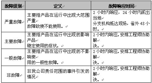 三、大明燈業(yè)的售后服務(wù)體系 1.直屬服務(wù)機構(gòu) 強大的技術(shù)力量和用戶支持隊伍正是大明燈業(yè)取得成功的優(yōu)勢所在。而大明燈業(yè)完善的服務(wù)支持體系是確保用戶照明系統(tǒng)順利實施和運行的可靠保障。大明燈業(yè)的技術(shù)支持與售后服務(wù)體系是由銷售部、技術(shù)部等相關(guān)部門以及一整套嚴格定義的流程和制度構(gòu)成的。 我們公司為客戶提供的服務(wù)體系包括:技術(shù)咨詢、用戶培訓、故障事件響應(yīng)、遠程維護等。通過公司的管理規(guī)范有效快速為客戶提供服務(wù),具體則通過企業(yè)內(nèi)服務(wù)規(guī)范及文檔的建立,服務(wù)過程記錄,服務(wù)監(jiān)督與投訴,保障公司承諾服務(wù)的實現(xiàn)。 2.客戶服務(wù)響應(yīng)中心 作為大明燈業(yè)對外服務(wù)的窗口和客戶關(guān)系的重要環(huán)節(jié),客戶服務(wù)響應(yīng)中心將本著用戶至上、服務(wù)優(yōu)質(zhì)、響應(yīng)及時的原則為我公司的用戶提供高效可靠的服務(wù)。在人員配備上,我公司選拔有經(jīng)驗、有責任心的員工作為客戶服務(wù)響應(yīng)中心的服務(wù)提供者。并通過一整套嚴格的服務(wù)規(guī)范和管理條例保障我們所提出的服務(wù)理念能夠有效的體現(xiàn)和貫徹。 其主要職責: 受理用戶服務(wù)請求、投訴、一般答疑。對服務(wù)請求、投訴按行業(yè)、事件的優(yōu)先級分類,立即與相關(guān)部門取得聯(lián)系,確定處理事件的方法并建立服務(wù)跟蹤卡,監(jiān)督、跟蹤對事件的處理過程。將處理結(jié)果文檔留存?zhèn)浒浮? 3.技術(shù)中心 技術(shù)中心是大明燈業(yè)的技術(shù)核心部門,其人員是由眾多資深的認證工程師和照明專家組成。具有很強的項目實施和保障能力,對產(chǎn)品應(yīng)用中出現(xiàn)的故障及潛在的問題能夠提出有效的解決方案并予以實施。 在用戶的關(guān)鍵應(yīng)用出現(xiàn)突發(fā)問題時,可以迅速組成緊急維護小組在最短的時間解決用戶的問題,以盡可能的方便用戶,保障客戶的利益。同時根據(jù)用戶的要求,大明的工程師可以通過網(wǎng)絡(luò),對異地用戶實施遠程咨詢,從而使我公司的用戶享受到最快捷的維護和服務(wù)。 大明燈業(yè)技術(shù)中心主要職能定義是提供產(chǎn)品的咨詢顧問服務(wù)以及技術(shù)支持服務(wù)和項目實施服務(wù)。針對企業(yè)客戶提出的具體需求,提供以下幾個方面的服務(wù): (1)以客戶經(jīng)營管理為背景的照明技術(shù)戰(zhàn)略性方案設(shè)計。 (2)以解決客戶實際問題為目的的解決方案設(shè)計與實施。 4.其他相關(guān)部門 大明燈業(yè)由眾多的分支部門組成,每個部門分別從事著不同的應(yīng)用領(lǐng)域。用戶的需求是多樣的,也是變化的,而大明燈業(yè)的業(yè)務(wù)深入了照明行業(yè)的相關(guān)領(lǐng)域,正是基于這樣的專業(yè)化的優(yōu)勢,我公司可以充分利用人員和技術(shù)力量方面的資源為用戶提供全方位的服務(wù),滿足用戶多樣的需求。 5.遍布全國各地的服務(wù)聯(lián)盟體系 為更加及時便捷響應(yīng)外地用戶的服務(wù)需求,大明燈業(yè)通過多年來與全國各地主要公司的合作,選擇了一批具備一定服務(wù)能力、具備良好服務(wù)意識的經(jīng)銷商,形成了強大的覆蓋全國的服務(wù)聯(lián)盟體系,為大明燈業(yè)在當?shù)氐挠脩籼峁┍憷? 四、相關(guān)細則 1.系統(tǒng)保修期(維護期)階段 在試運行期結(jié)束并通過最終驗收后,即進入產(chǎn)品的保修和維護期。從這個階段開始,系統(tǒng)正式進入實用階段,因而這一階段將成為系統(tǒng)整個支持和維護的工作中心和重點。本階段的工作主要由大明燈業(yè)進行,用戶方的技術(shù)人員協(xié)助。 售后技術(shù)服務(wù)采用兩種方式進行。第一種支持方式是直接在用戶現(xiàn)場工作的工程師,F(xiàn)場工程師有義務(wù)直接接受用戶的意見、投訴,親臨問題現(xiàn)場了解情況,并做出分析和判斷,但沒有權(quán)利對非其所屬的項目組的服務(wù)對象作出任何操作。 第二種支持方式是大明燈業(yè)專家組的技術(shù)支持。當極少數(shù)的問題未能很好解決時,將利用技術(shù)支持體系,給出圓滿解決。 2.保修期以后 (1)在本項目一次性購買的產(chǎn)品保修維護期過后,用戶可以根據(jù)自己具體的需求,經(jīng)過雙方協(xié)商,簽署相應(yīng)的服務(wù)協(xié)議,大明燈業(yè)將提供后續(xù)的服務(wù)與技術(shù)支持。 (2)在各規(guī)格照明產(chǎn)品所購買的保修期后,我公司承諾以不高于原合同的實際成交價格銷售客戶愿繼續(xù)使用的部件,并根據(jù)用戶的要求,經(jīng)過協(xié)商,提供相應(yīng)的服務(wù)內(nèi)容。 品質(zhì)和信譽是公司形象價值的重要部分,大明燈業(yè)堅持以技術(shù)和產(chǎn)品為依托、以服務(wù)為后盾,在不斷為用戶提供高品質(zhì)解決方案的同時,更以完善的全程服務(wù)確立了服務(wù)的新標準,讓用戶永無后顧之憂!