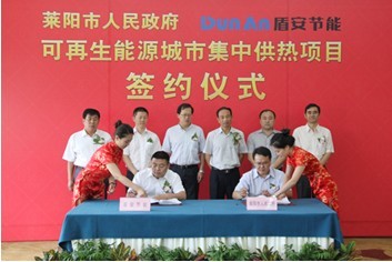 圖為盾安(天津)節(jié)能系統(tǒng)有限公司董事長付衛(wèi)亮(左)與萊陽市市長尹鵬簽署可再生能源供熱協(xié)議