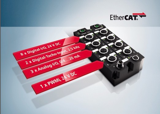 [2013年4月8日,德國(guó)] EP8309 EtherCAT 端子盒配備大量的 I/O 技術(shù),包括:八個(gè)數(shù)字量輸入和輸出端、兩個(gè)數(shù)字式轉(zhuǎn)速計(jì)輸入、兩個(gè)模擬量輸入、一個(gè)模擬量輸出和一個(gè)電流控制 1.2 A PWMi 輸出。通過(guò)這些接口,Beckhoff 提供了一套緊湊型防護(hù)等級(jí)為 IP 67 的解決方案,它是通過(guò) EtherCAT 控制各種設(shè)備的理想選擇。其不僅對(duì)空間的要求低,而且還簡(jiǎn)化了實(shí)地保護(hù)柜外的步線和安裝。 大小僅有 60 x 16 x 26.5 mm 的 EP8309 EtherCAT 端子盒為系統(tǒng)制造商提供了 I/O 的多樣性、強(qiáng)大的功能性和緊湊的設(shè)計(jì),大大降低了安裝工作。八個(gè)可自由選擇的數(shù)字量輸入和輸出提供了高度的應(yīng)用靈活性。該系列端子盒的功能在于其包含兩個(gè)使用 2.5 kHz 極限頻率的數(shù)字式轉(zhuǎn)速計(jì)輸入。它們可用于監(jiān)測(cè)兩個(gè)不同軸上的不同速度,或 – 使用簡(jiǎn)易數(shù)字傳感器 – 監(jiān)測(cè)一個(gè)軸上的旋轉(zhuǎn)速度和旋轉(zhuǎn)方向?蛇x功能還包括軸旋轉(zhuǎn)的監(jiān)測(cè)和止轉(zhuǎn)警告。 這些數(shù)字量 I/O 通過(guò)兩個(gè) 12 位分辨率的單端模擬量輸入、一個(gè) 12 位分辨率的單端模擬量輸出以及一個(gè) PWMi 輸出補(bǔ)全。例如,電流控制輸出可用于直接控制最大帶 1.2 A 電流的簡(jiǎn)易比例閥。智能閥則通過(guò)模擬量輸出控制。 隨著輸入端和輸出端的結(jié)合,EP8309 提供了一個(gè)通過(guò) EtherCAT 連接大量設(shè)備的緊湊型解決方案。預(yù)先接線且易于集成的 I/O 端子盒具有一個(gè)防護(hù)等級(jí)為 IP 67 塑料外殼,用于保護(hù)設(shè)備免受潮濕和極端溫度等惡劣環(huán)境的影響。因此,其特別適合用于分布式應(yīng)用,例如風(fēng)力發(fā)電機(jī)中的控制制動(dòng)系統(tǒng)。EP8309 用于液壓系統(tǒng)、齒輪箱和發(fā)電機(jī)應(yīng)用的適應(yīng)性版本也在準(zhǔn)備當(dāng)中。