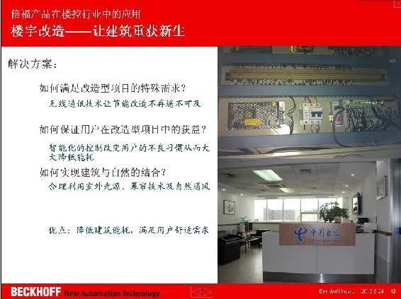 2013 年 6 月 9 日上午,由千家網主辦的“2013年綠色智能建筑運維管理趨勢論壇”在廣州進出口商品交易會展館A區(qū)6.1號館隆重舉辦,活動邀請了國內外知名企業(yè)高層與業(yè)界精英針對“綠色智能建筑運維管理趨勢”問題進行了深入地探討與交流,與會人員各抒己見,共話當前綠色智能建筑運營、維護、管理中的問題及探討未來發(fā)展趨勢。 德國倍福自動化有限公司技術支持工程師包立應邀出席了本次論壇,并在論壇上作了名為“倍福產品在樓控行業(yè)中的應用——樓宇自動化新技術”的主題報告。報告介紹了倍福的智能樓宇行業(yè)產品和解決方案在樓宇自控、樓宇改造、酒店客控、智能照明等領域的技術優(yōu)勢和應用情況,向現場與會的嘉賓展示了Beckhoff在智能樓宇行業(yè)的發(fā)展現狀和未來發(fā)展趨勢。 在樓宇自動化領域,倍福(Beckhoff)可全方位的設計集成式樓宇自動化方案:家居自動化照明、幕墻控制、操作和監(jiān)控、中央空調系統(tǒng)(HVAC)、獨立房間控制、遠程維護和能源數據記錄等。由于其開放式接口是基于IT 和Windows 標準的,因此Beckhoff 基于PC和以太網的控制技術自然就非常適用于樓宇自動化領域。此外、開放性是倍福樓宇自動化的優(yōu)勢所在,這樣的優(yōu)勢不但體現在其開放式的控制架構上,更體現在其集成性上。倍福所支持的通信協(xié)議豐富,EtherNet、TCP/IP、EnOcean、BacNet、RS232、RS485、LON、EIB/KNX、DALI、DMX、M-Bus,可滿足不同智能建筑的應用需求。 本次論壇旨在促進各方智慧碰撞,促進行業(yè)的健康發(fā)展,加強各企業(yè)的交流合作,共同開發(fā)綠色智能建筑這一巨大的市場,實現各方共贏。智能樓宇行業(yè)生產企業(yè)、用戶、工程商、集成商等業(yè)界人士歡聚一堂,就業(yè)內一些熱點問題進行深度探討,并根據目前綠色建筑節(jié)能的現狀,剖析了綠色智能建筑在運營、維護和管理中遇到的問題,共同展望了智能樓宇行業(yè)未來的發(fā)展遠景。