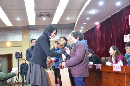 圖片注釋: 倍福中國人事行政部經(jīng)理仝紅艷向社區(qū)受助群眾送上慰問金和節(jié)日禮品