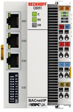 圖片注釋?zhuān)?/STRONG> CX8091 嵌入式控制器支持 BACnet 和 OPC UA 協(xié)議,非常適合用作一個(gè)小型本地控制器或者用作一個(gè)用于上位能源管理系統(tǒng)的數(shù)據(jù)采集器。