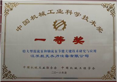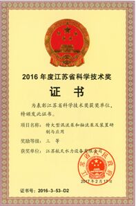 從江蘇省科技廳獲悉,江蘇航天水力設備有限公司申報的2016年江蘇省科學技術獎項目“特大型混流泵和軸流泵及裝置研制與應用”榮獲江蘇省科學技術獎三等獎。