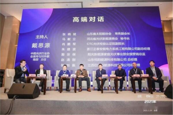 中國光伏行業(yè)協(xié)會宣傳與對外聯(lián)絡(luò)部主任戴思源主持上午的對話環(huán)節(jié)。山東省太陽能協(xié)會常務(wù)副會長張曉斌、河北省光伏新能源商會秘書長馬獻立、CTC光伏檢驗認證院副院長肖鵬軍,浙江正泰安能電力系統(tǒng)工程有限公司副總經(jīng)理朱建波、陽光新能源家庭光伏事業(yè)部全國營銷總監(jiān)殷宗保、山東悅陽能源科技有限公司總經(jīng)理趙清剛,江蘇巨擘新能源科技有限公司總經(jīng)理張加振參加本次對話環(huán)節(jié)。與會嘉賓對重點省份戶用光伏市場分析與預(yù)測、平價時代戶用光伏品牌企業(yè)發(fā)展戰(zhàn)略、戶用光伏電站質(zhì)量標準體系、“孤兒電站”售后運維管理、進行交流并對平價時代戶用光伏的商業(yè)模式進行討論。