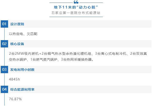 河北華電石家莊第一醫(yī)院(現(xiàn)稱石家莊市人民醫(yī)院)燃氣分布式能源項目采用以天然氣為基礎(chǔ)能源的先進的第三代冷、熱、電三聯(lián)供技術(shù),為醫(yī)院提供制冷、采暖、供電、生活熱水以及醫(yī)用蒸汽綜合能源服務(wù),是國內(nèi)首批“自發(fā)自用、并網(wǎng)不上網(wǎng)”的天然氣分布式能源項目,機組配置優(yōu)化,兩個“欠匹配”,回歸分布式本質(zhì)功能屬性,引領(lǐng)示范效應(yīng)顯著。項目由華電分布式能源工程技術(shù)有限公司承建,建成后由石家莊華電供熱集團有限公司負責運營。 該項目的建設(shè)是落實國家節(jié)能政策,建設(shè)節(jié)約型社會,實現(xiàn)可持續(xù)發(fā)展戰(zhàn)略的需要,功能是為石家莊第一醫(yī)院項目提供冷、熱、電、蒸汽綜合能源服務(wù),滿足醫(yī)院對能源的實際需求;夏季冷熱電聯(lián)供運行時,發(fā)電機組的高溫冷卻水可根據(jù)用能需求用于制冷或供熱,運行控制先進適應(yīng)性強;低溫煙氣用于制取生活熱水,排煙溫度低,能源綜合利用率高,該項目引入市政熱網(wǎng)作為采暖季熱源之一。 該項目建成后,與同容量常規(guī)燃煤熱電廠相比,年節(jié)約標煤2974.35t/a,節(jié)能率為27%;年CO₂減排12156.18t/a,減排率為48%,具有較好的經(jīng)濟和環(huán)境效益。設(shè)備滿足節(jié)能減排,提高經(jīng)濟效率的需要,對區(qū)域環(huán)境改善作用巨大。