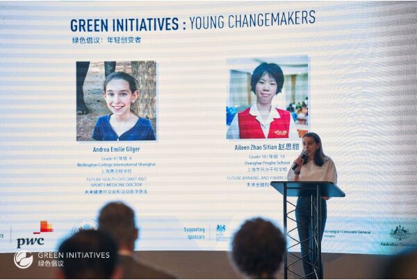 會議第二階段。綠色倡議的青年創(chuàng)變者項目邀請了來自上;蒽`頓學(xué)校九年級的Andrea Gilger, 和來自上海平和學(xué)校十年級的Aileen趙思甜,兩位少年環(huán)保先鋒,在第二階段的開場部分進行了每人2分鐘的發(fā)言,充分展示了年輕一代對于氣候和環(huán)境問題的關(guān)注和決心。