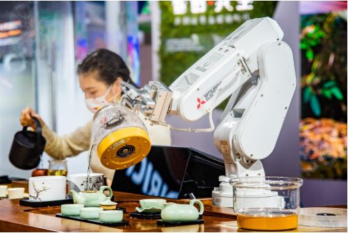 進博會上,三菱電機的創(chuàng)新探索體現(xiàn)于各事業(yè)領(lǐng)域的百花齊放。作為整個展臺的人氣亮點之一,上屆展會上大放異彩的茶道機器人再次登臺,向觀眾展示精湛茶藝,并與真人茶藝師同臺PK。
