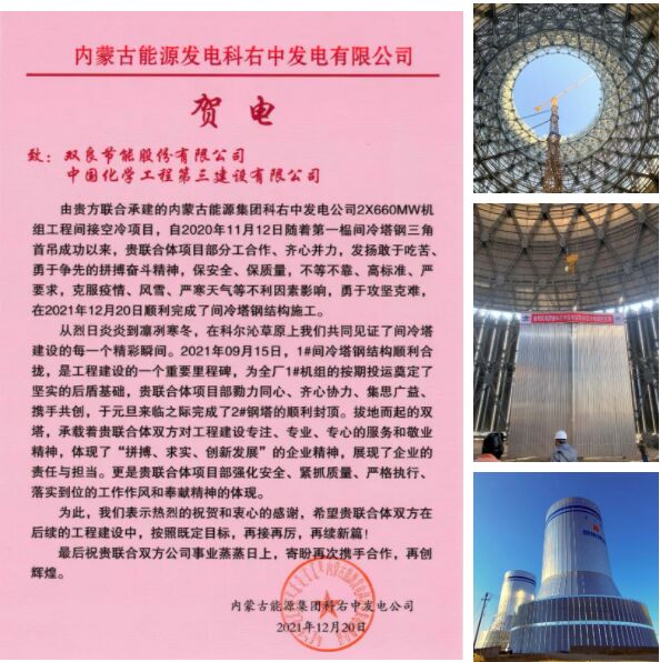 12月21日,在一陣陣鞭炮禮花聲中,由雙良節(jié)能承建的內(nèi)蒙古能源集團科右中發(fā)電廠2X660MW機組工程間接空冷項目,順利完成2#機組鋼結構間冷塔塔體封頂。至此兩座鋼結構間冷塔全部完成封頂,為電廠按期投運打下了堅實的基礎。