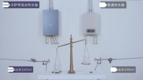 面對這類痛點(diǎn),什么樣的熱水器能夠解決呢?4月22日,卡薩帝官方平臺發(fā)布一段熱水器天平實(shí)驗(yàn)視頻。視頻顯示,卡薩帝「混動」熱水器和普通熱水器在同時(shí)開啟10分鐘后,工作人員用兩個(gè)量杯分別接10s熱水放在天平上?梢姡罢吡勘薪映龅乃慷,天平朝前者傾斜。相同時(shí)間運(yùn)行的熱水器,為什么出水量不同?差別在于兩臺熱水器的科技不同。