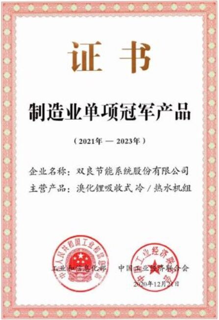 雙良溴化鋰吸收式冷 / 溫水機組榮獲由工信部、中國工業(yè)經(jīng)濟聯(lián)合會共同頒發(fā)的“ 中國制造業(yè)單項冠軍產(chǎn)品 ”證書。