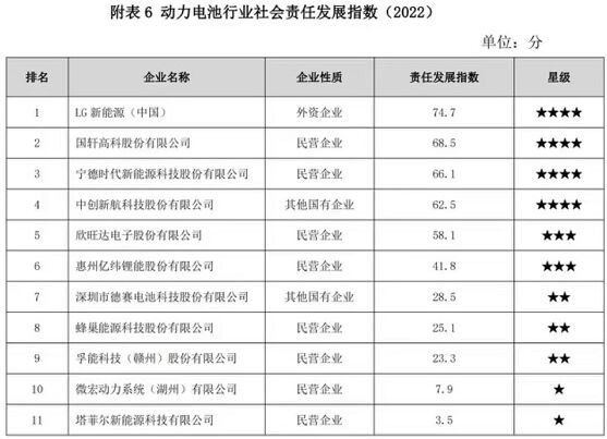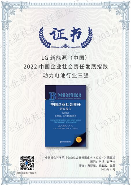 《企業(yè)社會責(zé)任藍(lán)皮書》由中國社會科學(xué)院社會責(zé)任研究中心編制,是目前中國企業(yè)社會責(zé)任領(lǐng)域最具影響力的研究成果!捌髽I(yè)社會責(zé)任發(fā)展指數(shù)(2022)”基于“通用指標(biāo)+行業(yè)特色指標(biāo)”評價(jià)體系,以企業(yè)性質(zhì)、所在行業(yè)為劃分標(biāo)準(zhǔn),對企業(yè)社會責(zé)任信息進(jìn)行內(nèi)容及定量分析的指數(shù)評價(jià)。LG新能源在綠色管理、綠色生產(chǎn)、綠色運(yùn)營的環(huán)境責(zé)任版塊,伙伴、員工、社區(qū)的社會責(zé)任版塊,責(zé)任管理的責(zé)任融合版塊,以及本質(zhì)責(zé)任的客戶責(zé)任板塊摘取八項(xiàng)最高評分,總評分名列榜首。此次排名的蟬聯(lián)及獎項(xiàng)的殊榮,既是對LG新能源在社會責(zé)任領(lǐng)域取得成效的有利認(rèn)可,也是對LG新能源作為動力電池行業(yè)的領(lǐng)軍企業(yè),在可持續(xù)發(fā)展和綠色產(chǎn)能方面做出貢獻(xiàn)的肯定。