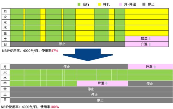 秉承著精益生產(chǎn),消除所有浪費的生產(chǎn)理念,電裝著手于提高能源利用效率,消除浪費的生產(chǎn)改善措施。通過將耗能最大的NB爐設備的生產(chǎn)狀態(tài)可視化并結(jié)合計劃進行集中生產(chǎn),連續(xù)運行NB爐,削減待機時間。通過上述消除浪費的節(jié)能行動,NB爐的使用率從原本的47%提升至100%。大幅提高能源利用率和員工工作效率,減少工時和待機時間,從而促進實現(xiàn)生產(chǎn)據(jù)點的降本增效。