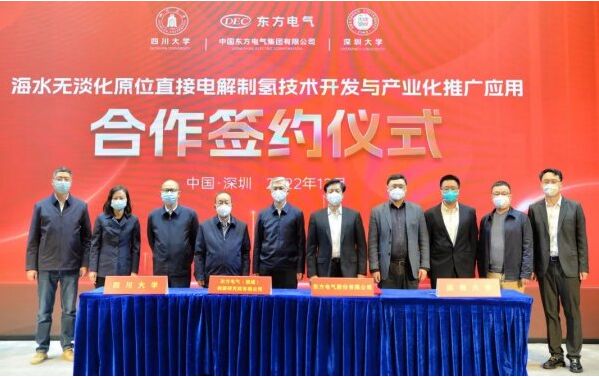 2022年12月16日,東方電氣股份有限公司、東方電氣(福建)創(chuàng)新研究院有限公司與四川大學(xué)/深圳大學(xué)謝和平院士團(tuán)隊在深圳簽署“海水無淡化原位直接電解制氫原創(chuàng)技術(shù)中試和產(chǎn)業(yè)化推廣應(yīng)用”的四方合作協(xié)議。中國工程院院士謝和平,東方電氣集團(tuán)黨組成員、副總經(jīng)理張彥軍,深圳大學(xué)副校長汪永成等出席簽約儀式。