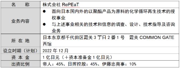 帝人株式會(huì)社(公司總部:大阪市北區(qū)、代表取締役社長(zhǎng)兼執(zhí)行董事CEO:內(nèi)川 哲茂,以下稱(chēng)“帝人”)、日揮控股株式會(huì)社(公司總部:橫濱市西區(qū)、代表取締役會(huì)長(zhǎng)CEO:佐藤 雅之,以下稱(chēng)“日揮HD”)、伊藤忠商事株式會(huì)社(公司總部:東京都港區(qū)、社長(zhǎng)COO:石井 敬太,以下稱(chēng)“伊藤忠商事”)以授權(quán)化學(xué)回收聚酯產(chǎn)品的技術(shù)為目的,就設(shè)立合資事業(yè)公司“株式會(huì)社RePEaT”(以下稱(chēng)“RePEaT”)之事宜簽訂了合資合同。