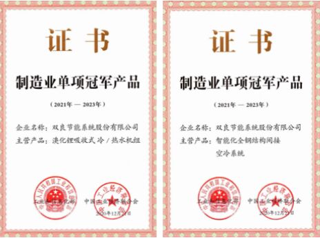 雙良溴化鋰吸收式冷 / 溫水機(jī)組、智能化全鋼結(jié)構(gòu)間接空冷系統(tǒng),榮獲由工信部、中國(guó)工業(yè)經(jīng)濟(jì)聯(lián)合會(huì)共同頒發(fā)的“ 中國(guó)制造業(yè)單項(xiàng)冠軍產(chǎn)品 ”證書。