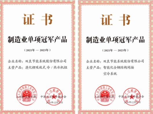 雙良溴化鋰吸收式冷 / 溫水機(jī)組、智能化全鋼結(jié)構(gòu)間接空冷系統(tǒng),榮獲由工信部、中國工業(yè)經(jīng)濟(jì)聯(lián)合會共同頒發(fā)的“ 中國制造業(yè)單項(xiàng)冠軍產(chǎn)品 ”證書。