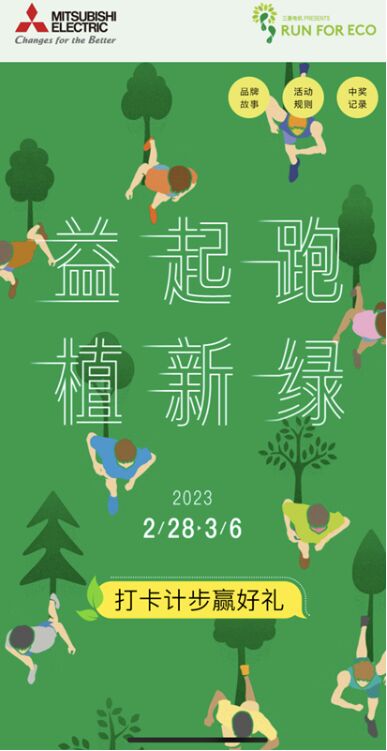 2023年2月28日至3月6日,三菱電機(jī)(中國)有限公司(以下簡稱“三菱電機(jī)”)再度攜手中華環(huán)境保護(hù)基金會,發(fā)起RUN FOR ECO“益起跑 植新綠”線上公益活動,該活動旨在為關(guān)心環(huán)境問題的社會各界人士提供社會貢獻(xiàn)的平臺,將環(huán)保與跑步運(yùn)動巧妙地融合在一起,無論男女老少皆可輕松參與,通過打卡累計步數(shù)獲取的EcoPoint積分換算成相應(yīng)的善款,以支持中國環(huán)保事業(yè)。