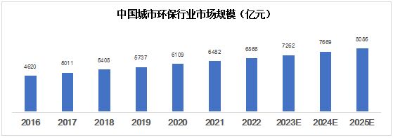 自2020年起,我國環(huán)保行業(yè)的營業(yè)收入占 GDP的比例便已達(dá)到并維持在2%左右。根據(jù)市場調(diào)研在線網(wǎng)發(fā)布的分析報(bào)告顯示,2016年中國城市環(huán)保行業(yè)市場規(guī)模為4620億元,2022年已達(dá)6866億元,并將在 2025年達(dá)到8086億元。