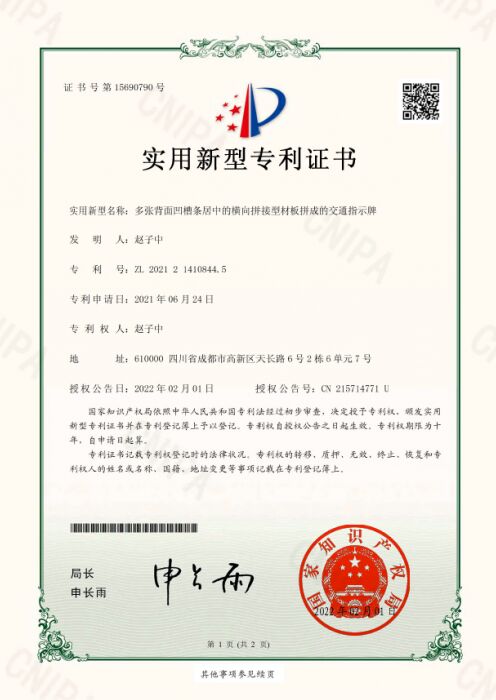 (交通指示牌的新型材料專(zhuān)利證書(shū))