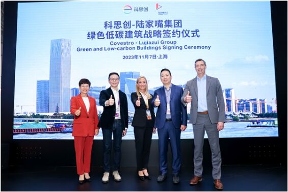 ( 科思創(chuàng)攜手陸家嘴集團(tuán),推進(jìn)綠色低碳建筑發(fā)展。左起:科思創(chuàng)中國(guó)區(qū)總裁雷煥麗,陸家嘴集團(tuán)總經(jīng)理蔡嶸,科思創(chuàng)定制化聚氨酯事業(yè)部全球負(fù)責(zé)人Christine Bryant,陸家嘴集團(tuán)董事長(zhǎng)徐而進(jìn),科思創(chuàng)首席執(zhí)行官施樂文博士 © 科思創(chuàng) )
