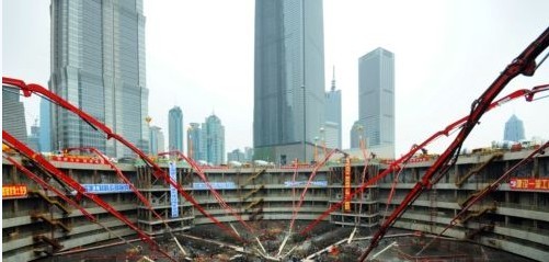 世界罕見 18臺泵60小時一次泵送混凝土60000方 632米上海中心底板澆注施工成三一泵表演專場 上海世博會開幕在即。3月28日,上海陸家嘴,一棟改寫中國建筑高度的大廈圓滿完成6萬方混凝土底板澆注,即將破土而出。4年后,上海中心,這幢設(shè)計高度為632米的大樓將輕松奪走492米上海環(huán)球金融中心“中國第一高樓”的桂冠。 60小時的施工奇跡 2010年3月28日,美麗的黃埔江畔。 江邊405臺白色的混凝土攪拌車,似一條條從江邊延伸出來的銀色支流,把江邊5個攪拌站中的混凝土,連綿不絕地運往同一個目的地——上海中心。 在那里,18臺泵均勻地分布在一個直徑121米、深30米左右的大坑邊,等待著它們一次次“喂送”。