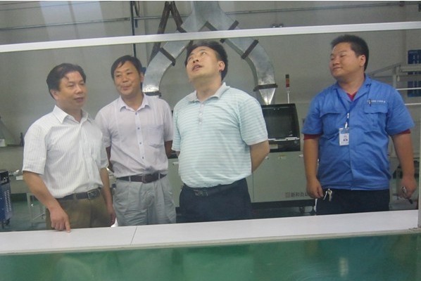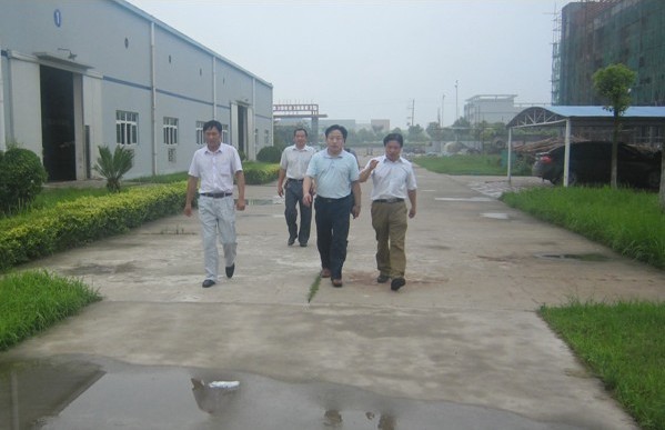 圖為松滋市發(fā)改局局長(zhǎng)羅明雄(右二)、副局長(zhǎng)張磊(左二)、李主任在營(yíng)銷總監(jiān)文純陽(yáng)的陪同下參觀大明燈業(yè)生產(chǎn)基地。