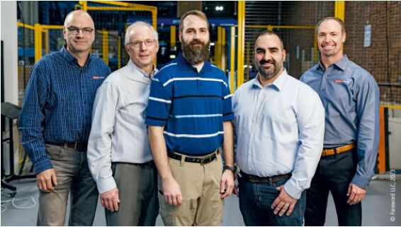 自動化技術(shù)和機器人專家們在波士頓動力公司的測試中心:(左起)倍福內(nèi)部物流行業(yè)應(yīng)用專家 Gilbert Petersen;倍福區(qū)域銷售經(jīng)理 Brian Buck;波士頓動力公司 Stretch 硬件技術(shù)總監(jiān) Matthew Meduna;波士頓動力公司供應(yīng)鏈總監(jiān) Eric Landry;以及倍福全球物料搬運和內(nèi)部物流行業(yè)經(jīng)理 Doug Schuchart