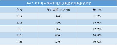 2021年作為“十四五”規(guī)劃的開局之年,雖然受能源雙控和環(huán)保高壓的影響,疊加汛情、疫情、臺(tái)風(fēng)、限電等因素影響,下游投資有所減緩,但全年宏觀政策跨周期調(diào)節(jié)扎實(shí)推進(jìn),中國(guó)經(jīng)濟(jì)持續(xù)穩(wěn)定恢復(fù),能源清潔低碳轉(zhuǎn)型深入推進(jìn),產(chǎn)業(yè)升級(jí)、結(jié)構(gòu)優(yōu)化持續(xù)發(fā)力,中高壓通用變頻器市場(chǎng)呈現(xiàn)高速增長(zhǎng)。 2021年中國(guó)中高壓通用變頻器整體市場(chǎng)規(guī)模為 55億元,同比增長(zhǎng) 19.6%。