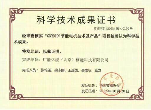創(chuàng)新驅(qū)動發(fā)展,科技成就未來。廣能億能(北京)核能科技有限公司“GNYNHN節(jié)能電機技術(shù)及產(chǎn)品”被中國節(jié)能協(xié)會認定為科學技術(shù)成果,標志著廣能億能核能的節(jié)能電機技術(shù)邁上了一個新臺階。