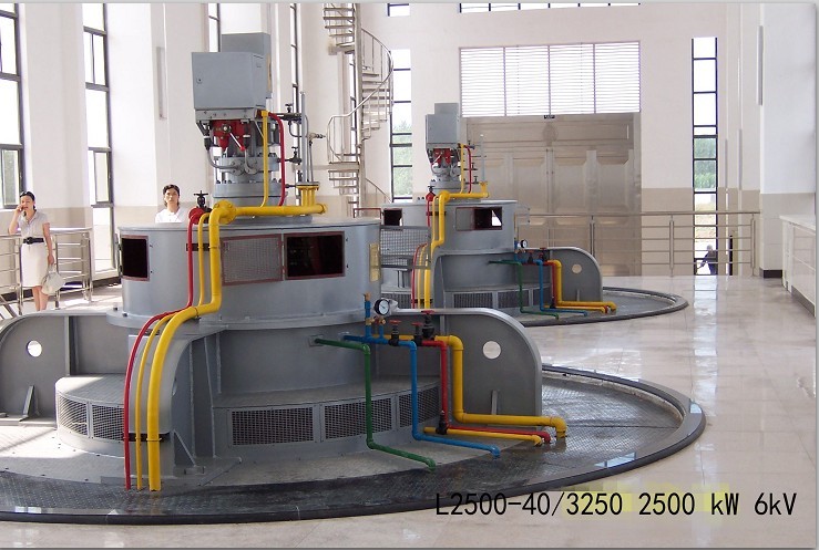 產(chǎn)品介紹 本公司制造的TL、TDL系列立式同步電動(dòng)機(jī)主要用于驅(qū)動(dòng)立式軸流、混流泵,電機(jī)結(jié)構(gòu)為二導(dǎo)懸垂型。上機(jī)架內(nèi)有推力軸承及導(dǎo)軸承,下機(jī)架內(nèi)有導(dǎo)軸承,上下機(jī)架內(nèi)均設(shè)油池,軸承為油浴自潤滑。冷卻方式為自扇冷型、半管道通風(fēng)型或帶冷卻器密閉循環(huán),電機(jī)定子采用線圈軟體下線、VPI整體浸漆技術(shù)。電機(jī)帶有測(cè)溫元件以監(jiān)控溫度,還帶有電子測(cè)速裝置、需要時(shí)可帶高壓油頂起裝置。勵(lì)磁裝置一般采用微機(jī)型全控裝置。 TGB系列與貫流泵配套,可潛入水中運(yùn)行,適用于低揚(yáng)程、大流量。 SF、SFW系列立式、臥式水輪發(fā)電機(jī)與水輪機(jī)配套,用于中小型水電站。 Introduction of Products TL, TDL Series vertical synchronous motors manufactured by NTC-NCF are mainly used for driving vertical axial flow and mixed flow pumps. Motor structure is two guide bearings overhang type,thrust bearing and guide bearing in upper frame and only guide bearing in lower frame. Both upper and lower frame are all oil pool. The bearing is oil-jacked self-lubrication. Cooling mode is self-fan cooling type, half piping ventilation type or close cycle with cooler. Motor stator uses soft status winding and VPI treated technology. Motor has thermo-elements to monitor temperature, electronic tachometer and high pressure oil jacking device when needed. The excitation device currently uses micro- computer control device. TGB Series motors are matched with penetration pumps. They can dive into water to operate. They are suitable for low lift and large flow. SF, SFW Series vertical and horizontal water turbogenerators are matched with water turbines for medium and small-sized hydropower station.