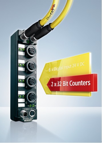 IP 67 緊湊型端子盒中集成了 32 位快速脈沖計(jì)數(shù)器 EtherCAT端子盒 EP1518 集成了大量功能:32 位計(jì)數(shù)器、帶傳感器診斷功能的數(shù)字量輸入和可調(diào)節(jié)的濾波器功能。將這些功能整合在一個(gè)模塊里使得應(yīng)用更加靈活,且大大降低了物流成本。 EP1518 有 8 個(gè) 24 V DC 數(shù)字量輸入以及一個(gè)EtherCAT輸入端口和一個(gè)EtherCAT輸出端口,用于連接處理層。EtherCAT端子盒以最高 1 kHz 的計(jì)數(shù)頻率計(jì)算快速脈沖。集成的數(shù)據(jù)預(yù)處理功能能夠可靠、獨(dú)立于控制周期時(shí)間地計(jì)數(shù)脈沖。 在傳輸狀態(tài),EP1518 被設(shè)置成兩個(gè) 32 位的加/減計(jì)數(shù)器。每個(gè)計(jì)數(shù)器都有一個(gè)可以禁用的加/減和門輸入。兩個(gè)輸入可提供用于標(biāo)準(zhǔn)功能。此外,IP 67 端子盒的所有 8 個(gè)信號(hào)輸入通過EtherCAT作為標(biāo)準(zhǔn)數(shù)字量信號(hào)傳輸。 此外,EtherCAT端子盒具有通過傳感器饋電診斷實(shí)現(xiàn)的短路檢測功能;谲浖妮斎脒m應(yīng)功能通過 0…100 ms之間可調(diào)的濾波時(shí)間可以實(shí)現(xiàn)對最多樣化的傳感器/開關(guān)的適應(yīng)。
